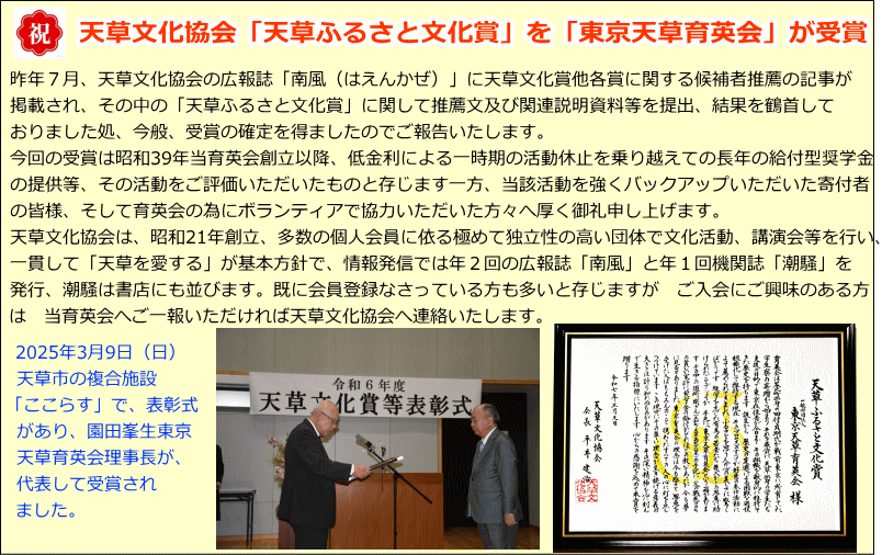 ・2022/7/1(お知らせ) 2021年度事業報告及び決算については 6月8日理事会で討議、いずれも決議され 引き続き6月22日評議員会で報告され、承認されました。 ・2022/6/7(お知らせ) 第4回理事会、第2回評議員会 昨年同様、コロナ感染状況に鑑み、本会理事会及び評議員会(2022年度事業計画、予算案)は令和4年3月18日に書面によるみなし決議により原案どおり議決されたことをご報告いたします。奨学生支援のため、多くの皆様から御寄附頂きましたことを心より厚く御礼申し上げます。 ・2021/12/8(育英会活動報告) 当奨学生希望者への説明会 昨年度は新型コロナ感染影響のため、天草での東京天草育英会説明会を行うことができませんでしたが、今年度は去る11月22日(月)午後4時から天草高校において御担当の瀬崎教諭の協力のもと奨学生希望生徒の参加を得て、当育英会から園田理事長、金子秀明評議員、天草在住奨学生OBが出席して説明会を実施致しました。 説明会に先立ち、牛深高校、拓心高校、天草工業高校を訪問し、奨学金担当の先生に東京天草育英会の資料を手渡し、概要の説明も行うこ とができました。時間の関係から上天草高校を訪ねることはできませんでしたが、電話にて同様の説明を行い資料も送付致しました。天草の高校、役所など関係機関との交流を深めて参り度いと思います。・2021/6/28(育英会活動報告) 当天草育英会の令和2年度事業報告、決算報告の理事会、評議員会については、新型コロナウィルス感染状況が続いていることもあり、書面によるみなし決議の方法により承認されましたことをご報告致します。これに伴い、内閣府への報告も済ませました。 関係各位の御力添えにより多くの御寄付いただき、奨学金給付活動ができたことに改めて御礼申し上げます。今年度も引き続き御支援の程、お願い申し上げます。 一般財団法人東京天草育英会 理事長 園田峯生 ・2021/4/19(お知らせ) 2020年度第二回理事会、評議員会 当育英会の今般の理事会、評議員会(事業計画、予算案)は新型コロナウィルス感染予防が為、集会は避け 書面に依るみなし決議と致しましたことをご報告します。 新型コロナウィルス感染では変異型も加わり 第四波との報道もあります。そのような中 昨年度に増して多数の方々から寄付をいただき 心から厚く御礼申し上げますと共に皆様どうかご自愛願います。 ・2021/2/4(お知らせ) 当育英会評議員の金子秀明さんの活動が外務省の広報マガジンに紹介されました。新型コロナ感染が流行の中、明るいニュースですのでご案内します。外務省HPへの掲載はこちらを、外務省FBはこちらをご覧ください。 ・2020/6/30(お知らせ) 新型コロナウィルスの流行に係る感染予防に鑑み、今般の理事会、評議員会に際しましては書面に依るみなし決議がなされました。 詳細は、こちらをご覧ください。 ・2020/2/17(お知らせ) 奨学生のOBの皆さんからのお便りを掲載する「奨学生通信」のコーナーを新設しましたので、ご覧ください。(右下の「奨学生通信」のバナーをクリック願います。)園田理事長からのご挨拶「平成23年度に給付再開後、奨学生は社会に巣立ち、活躍をしているものと存じ、近況を連絡をいただく方々もいます。 一方、世の中は不確実性が増している中、奨学生や育英会の将来に鑑み、情報発信を多様化することで新たな絆もできるのではないかと期待し今回先ずはOBを中心に奨学生通信をホームページ上に開設しました。ご高覧いただけますと幸甚です。」 ・2019/12/16(育英会活動報告) 12月7日(土) 奨学生を囲んでの懇談会・懇親会が有楽町で開催され、奨学生OB.・現役6名を含む21名が参加しました。理事長挨拶、奨学 生の近況報告、講話、出席者挨拶等が続き3時間に亘、和気藹々とした雰囲気でした。平成23年奨学金給付再開後、諸支援を得て当育英会では小規模乍らも毎年奨学生を継続的に支援しています。今後とも奨学生の役に立つことができれば幸甚です。・2019/11/25(育英会活動報告) 11月23日(土)園田理事長が昨年に続き 天草の高校を訪問、東京天草育英会の活動と募集等に関して学生に説明しました。説明会開催に当たっての天草高校ご協力を厚く御礼申し上げます。尚、田付理事も同行、少子高齢化や今後の環境を踏まえての若手への期待等も説明しました。 ・2019/6/26(役員退任・再任について) 天草育英会の理事を務めて頂いた永野理事が6月22日(土)の評議員会をもって理事を退任されました。永野理事には当育英会奨学生の先輩として奨学生や郷里高校との連絡役、広報など多方面に亘りご活躍頂きました。感謝申し上げます。任期満了となった荒木、園田、藤川の各理事は同評議員会において再任となっています。 ・2019/6/25(育英会活動報告) 6月22日(土)千代田区九段上集会室で理事会・評議員会が開催されました。平成30年度事業報告、決算報告、奨学生選考、理事改選、監査報告等議事は進み、特に問題なく終了しました。今年の新人奨学生は2名で、昨年同様7名に給付致します。引き
