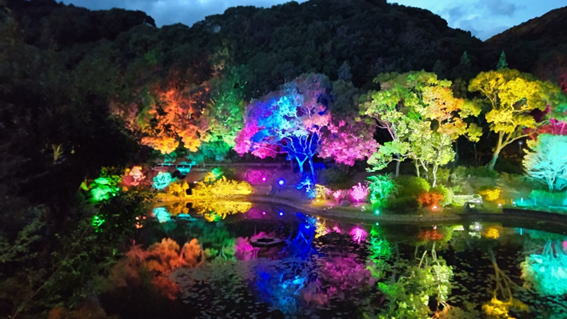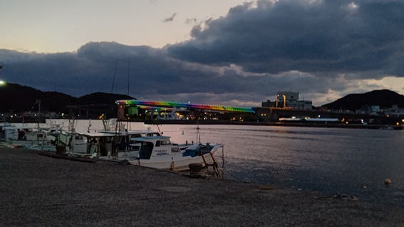 | <天草から> 牛深でイルミネーションが開催されています。 熊本日日新聞等でも報道されていますが、天草ロマンティックファンタジーの一環として牛深ハイヤ大橋が10色にイルミネーションされています。 橋の真下、道の駅・海彩館周辺もライトアップされており、そちらと合わせて楽しめるかと思います。 また、昨年に引き続きうしぶか公園の日本庭園もイルミネーションがあり、
